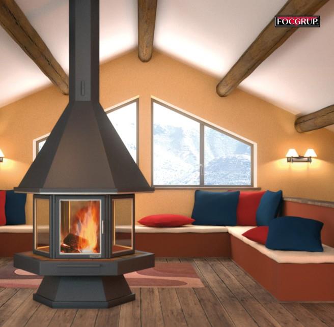 Central fireplace with glass in anthracite-painted steel, ideal for a classic decor. Featuring a unique hexagonal shape with 6 glass sides.