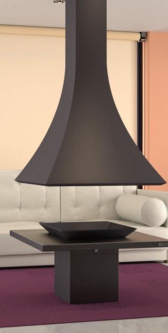 Open central fireplace in anthracite-painted steel, ideal for modern minimalist decor. Unique hood attached to the pipe cover suspended from the ceiling.