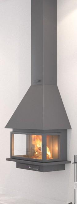 Decorative and heating suspended fireplace suitable for wall installation. Very clean and minimalist design.
