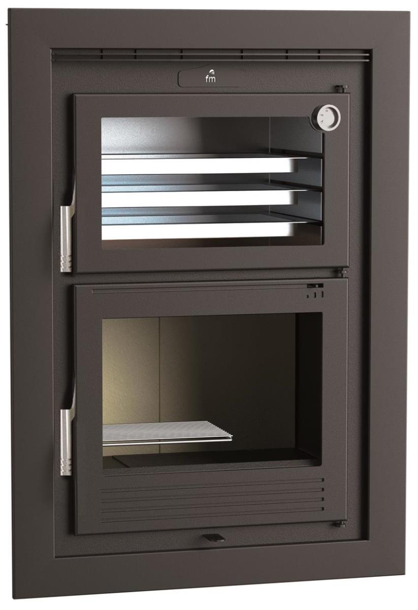 Four à bois encastrable en acier peint anthracite résistant à 650°. Porte avec cristal en vitrocéramique résistant à 750°. Four en acier inoxydable avec thermomètre pour contrôler la température de cuisson.