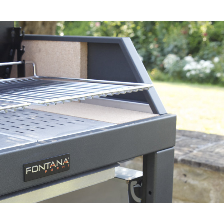 Grill aperto con braciere super-rinforzato e rivestimento in pietra refrattaria. Disponibile in due misure di superfice di cottura: l’80×40 cm e il 110×40 cm. La struttura è in acciaio e inox con due comodi pianetti ripieghevoli e un carrello su 4 ruote per un ampia trasportabilità.