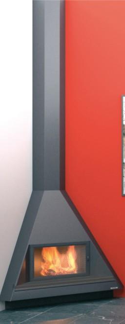Caminetto d’arredamento e da riscaldamento adatto ad essere applicato ad un angolo. La particolare forma triangolare lo rende particolarmente adatto ad arredamenti moderni.