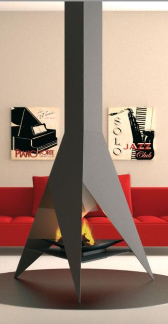 Caminetto centrale aperto in acciaio verniciato antracite ideale per un arredamento modermo minimalista. Modello unico e particolare nella forma che sicuramente valorizzerà il vostro ambiente