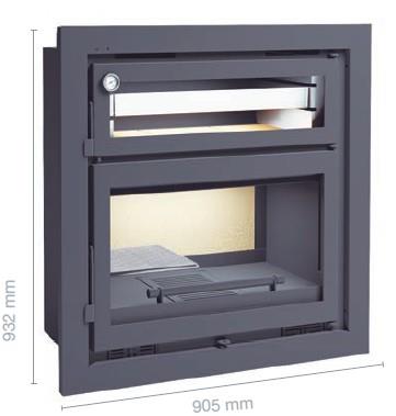 Inserto a legna con forno incorporato. Interno in vermiculite con vetro ceramico resistente a 650°. Il forno e da usarsi per la cottura di cibi a livello domestico.