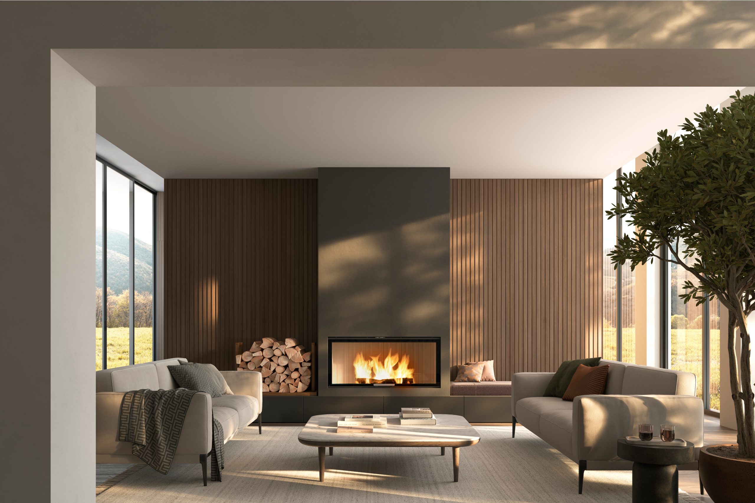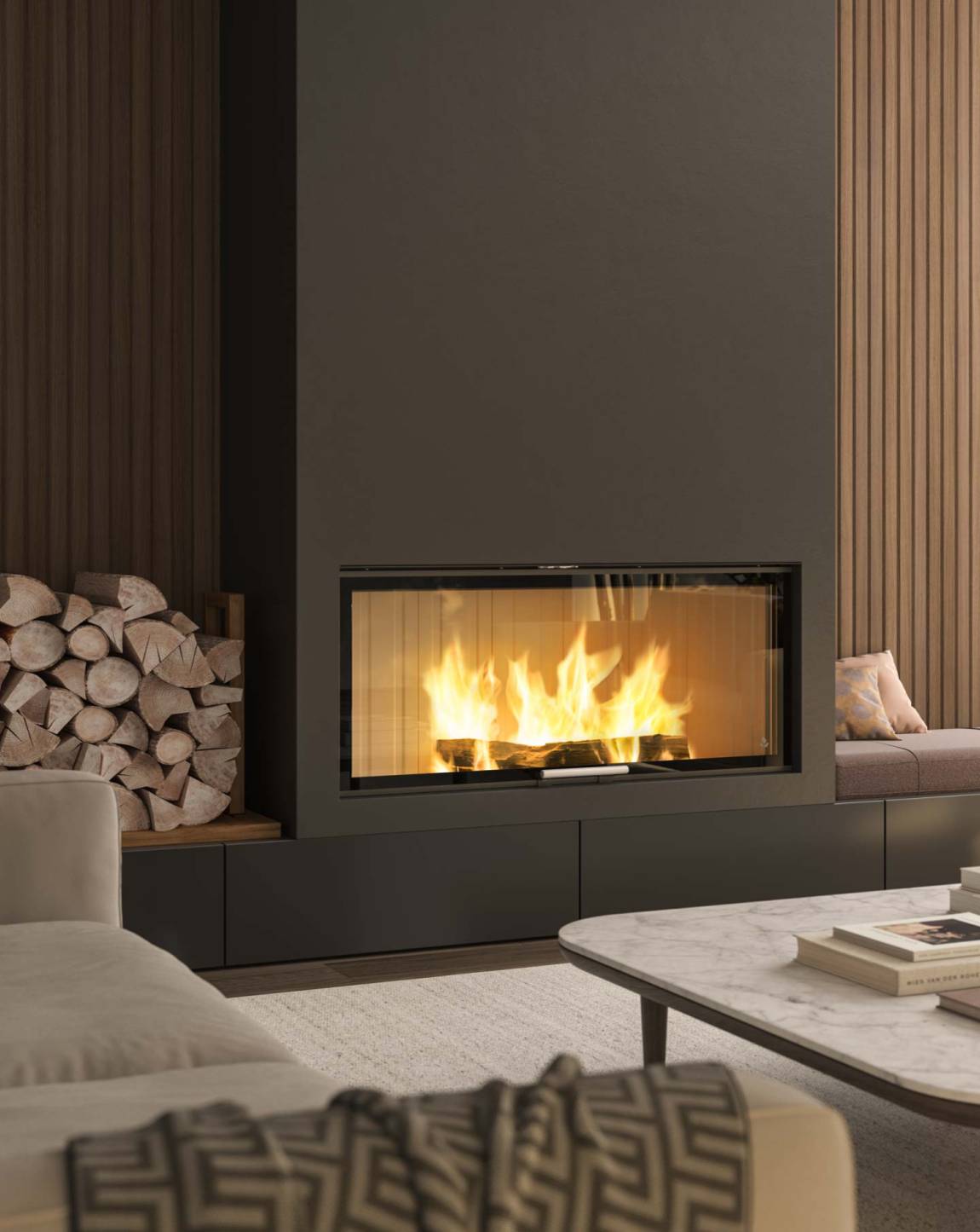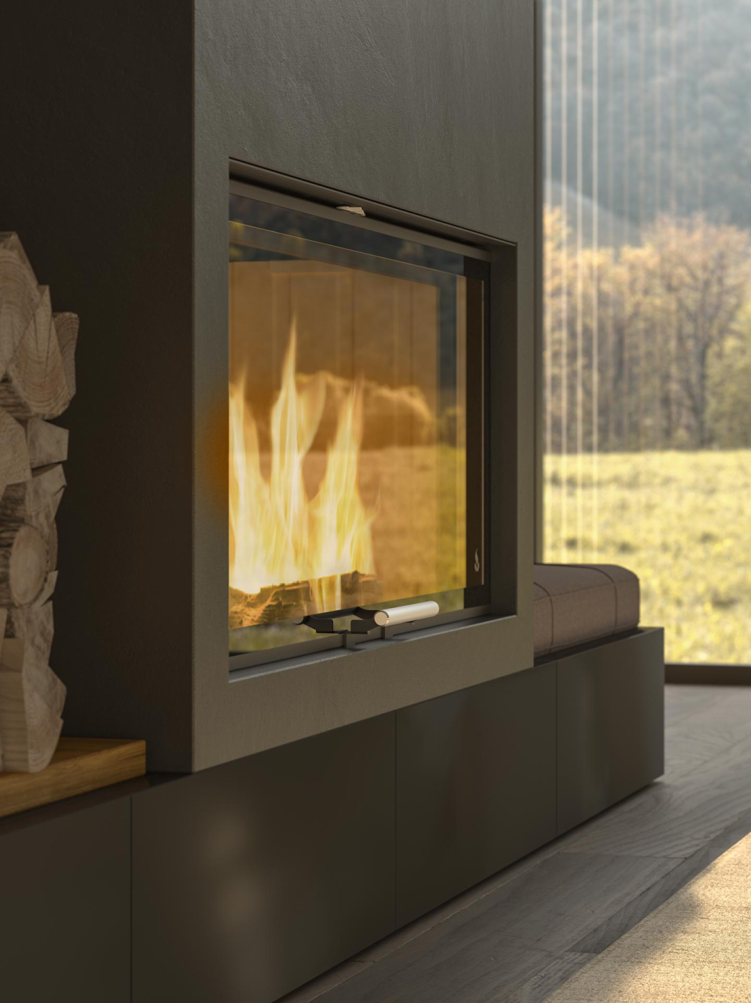 È possibile scegliere tra la versione frontale o i modelli con vetro angolare nelle varianti 80, 100 e 120. La cornice in vetro minimale e l’interno in refrattario bianco Keraltek offrono una vista mozzafiato della fiamma, permettendo di apprezzarne la bellezza anche quando è spenta.
