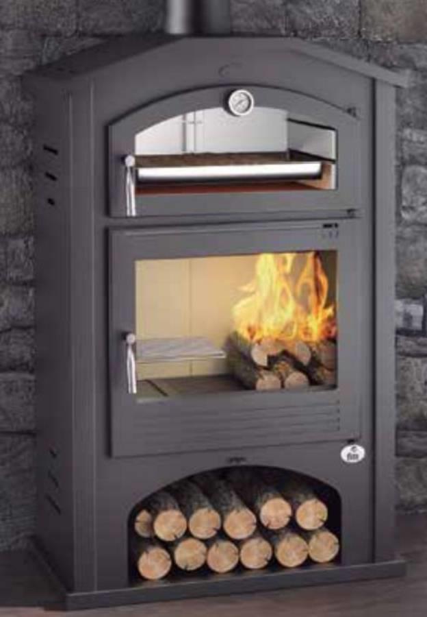Stufa a legna in acciaio verniciato antracite resistente a 650°. Porta con cristallo vetroceramico resistente a 750°. Forno in acciaio inox con termometro per regolare la temperatura di cottura.